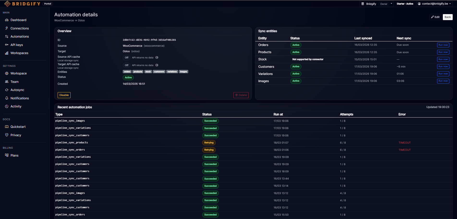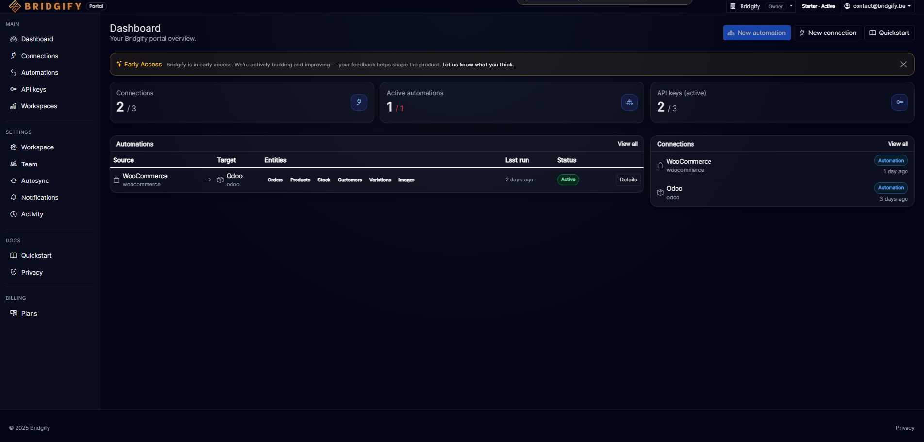 Bridgify synchroniseert orders, producten en klanten tussen WooCommerce, Odoo en meer — via Automations of een Unified API. We voegen actief meer connectoren toe.
